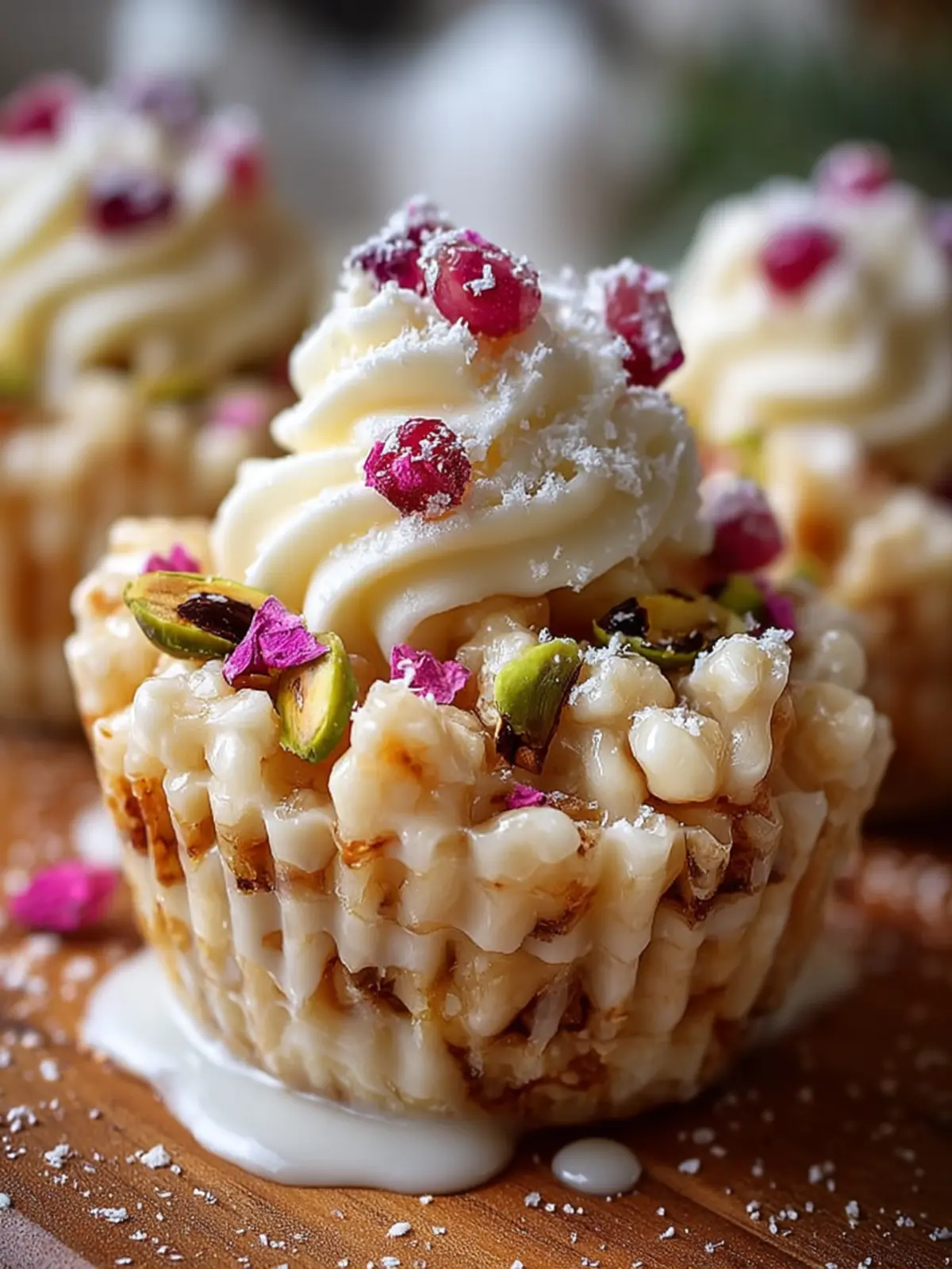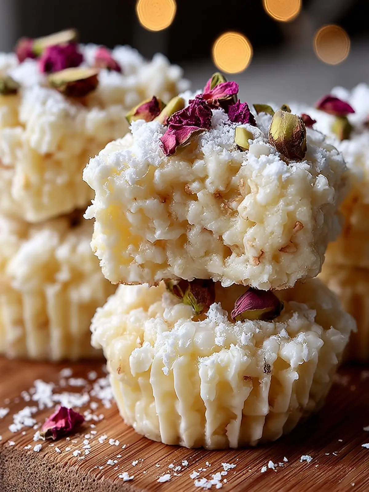 Delicious and easy-to-make white chocolate treats with puffed rice, coconut, and crunchy pistachios.