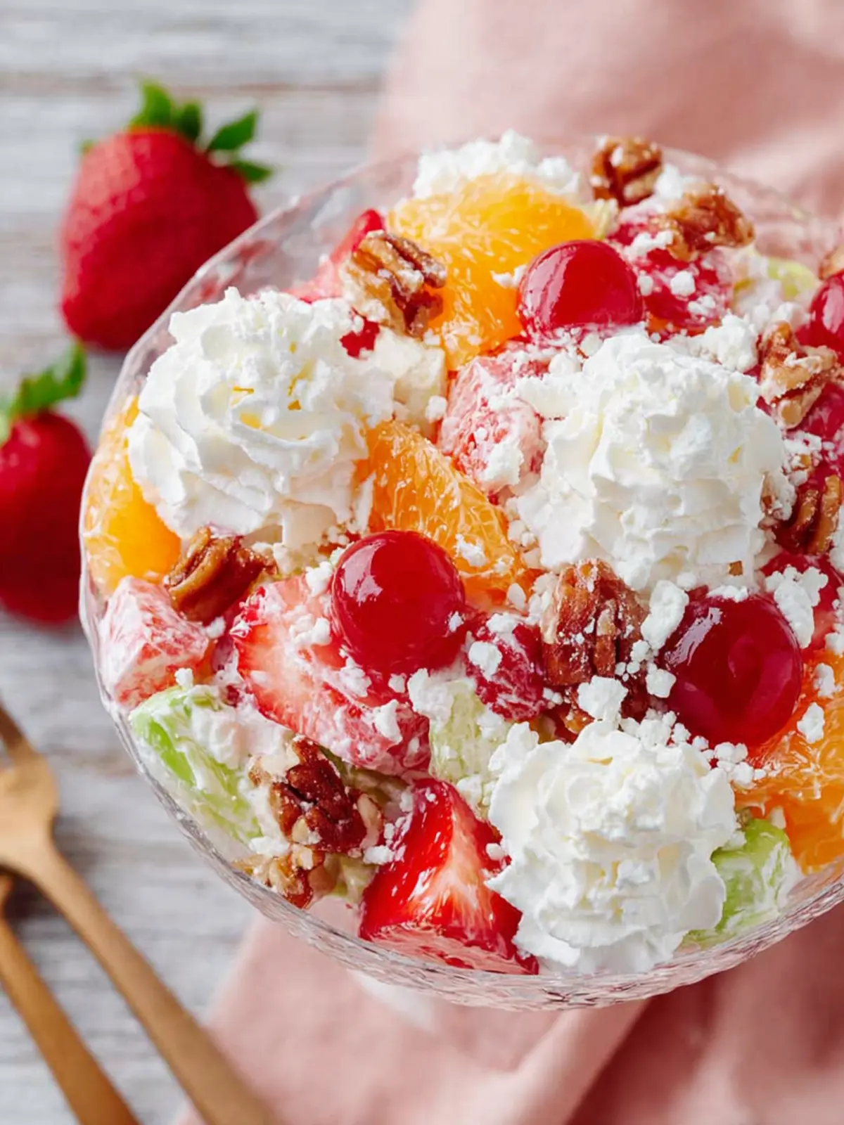 Simple Ingredients: Often made with easily accessible ingredients like marshmallows, cherries, and mandarin oranges, this recipe is both simple and adaptable. Many people have their own family recipes, passed down through generations, making it unique to each household.