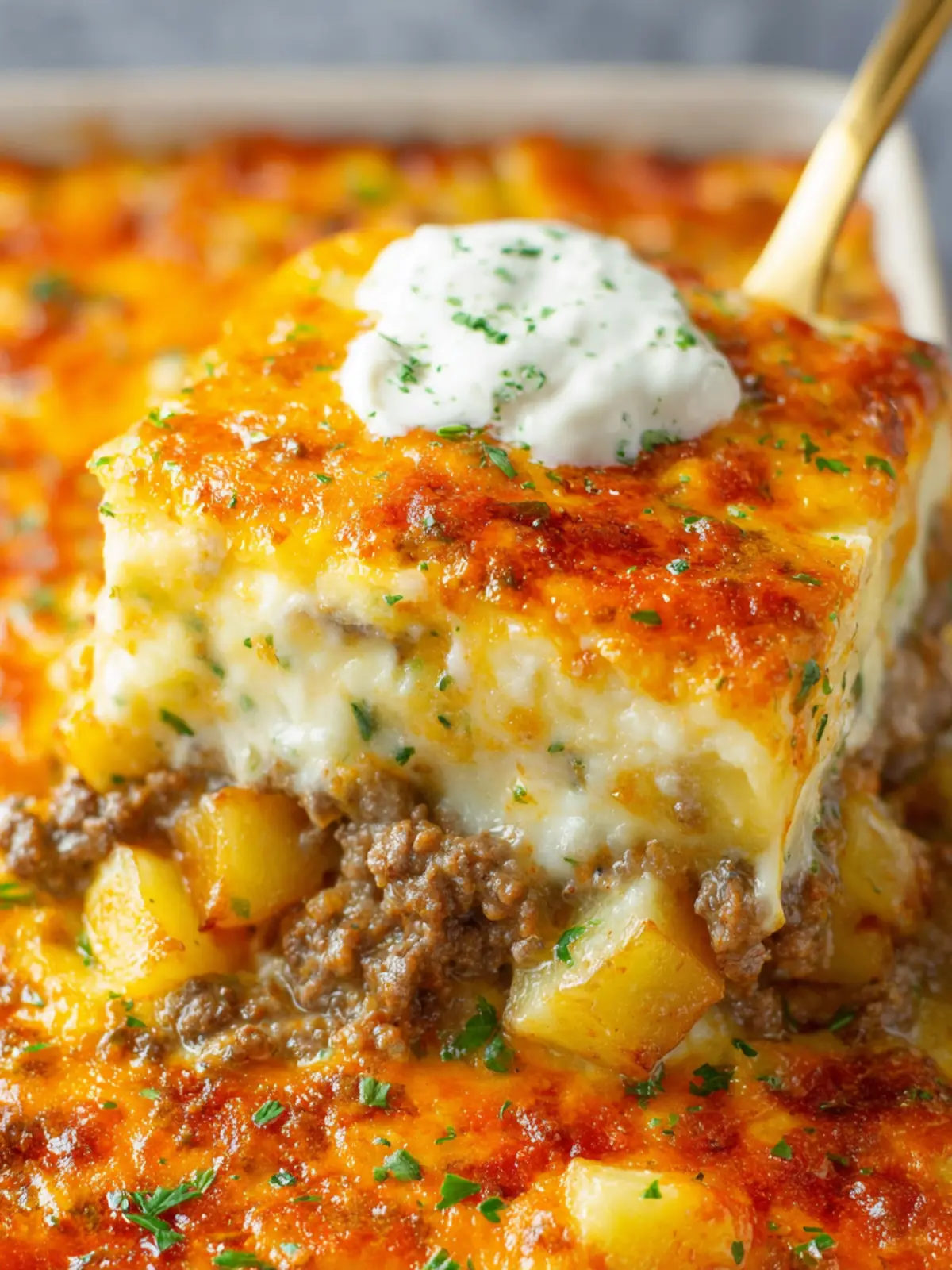 A comforting casserole made with layers of beef, potatoes, and creamy cheese.