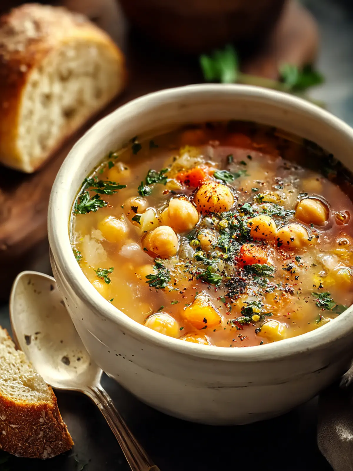 A hearty and nutritious soup made with chickpeas, white beans, and fresh vegetables, seasoned with cumin and paprika.