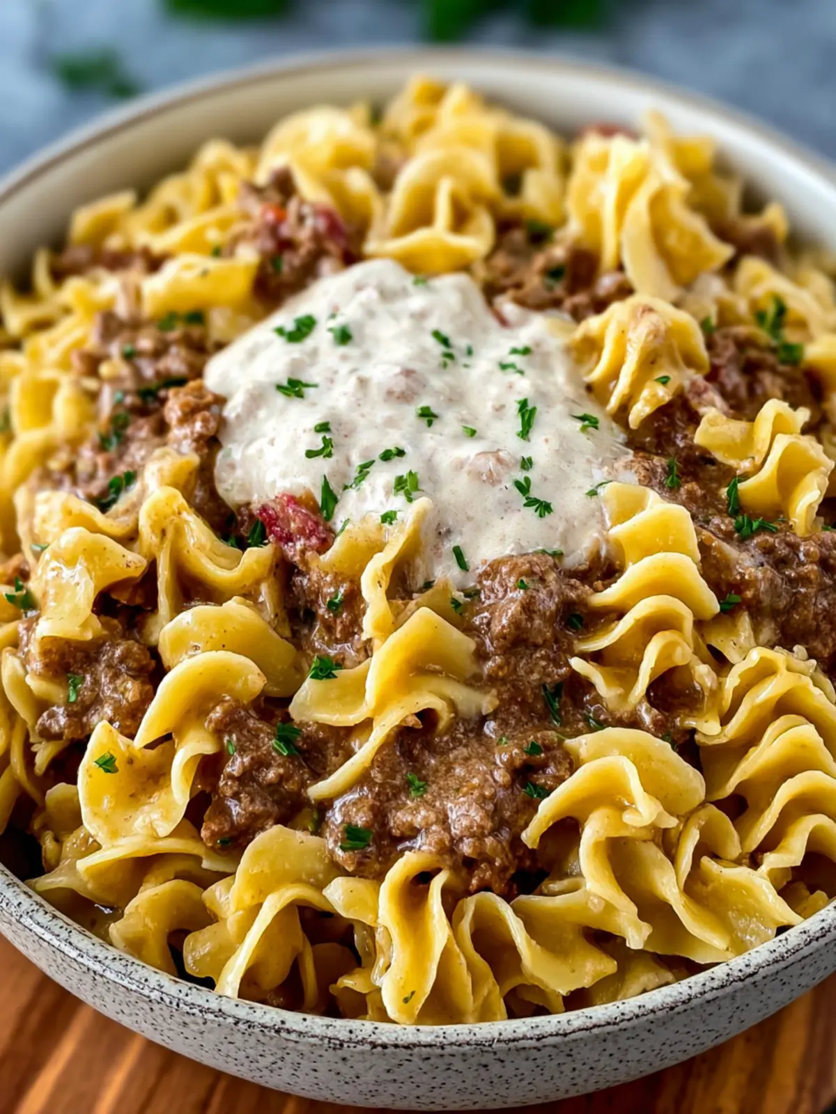 A hearty and creamy dish made with ground beef, egg noodles, and sour cream.