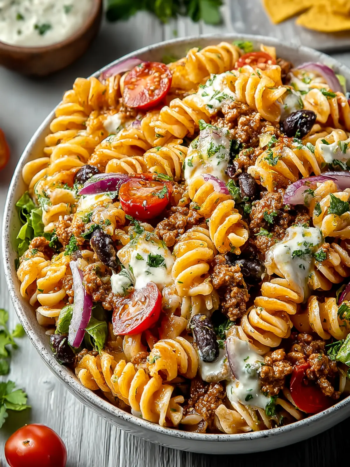 A delicious taco pasta salad that combines rotini pasta, lean ground meat, and fresh vegetables with a zesty ranch dressing.