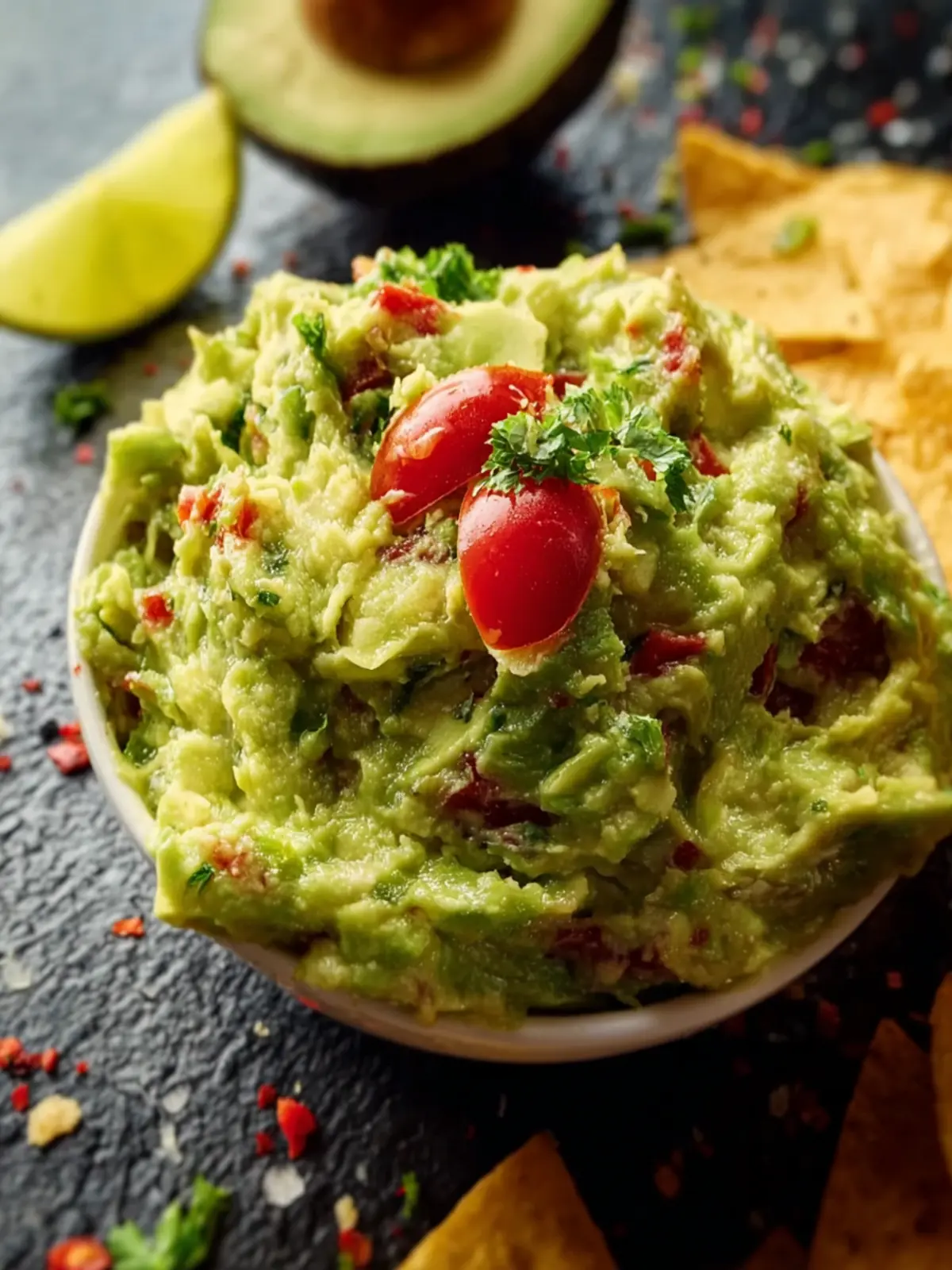 A delicious and creamy guacamole made with ripe avocados, fresh lime, tomatoes, and spices.