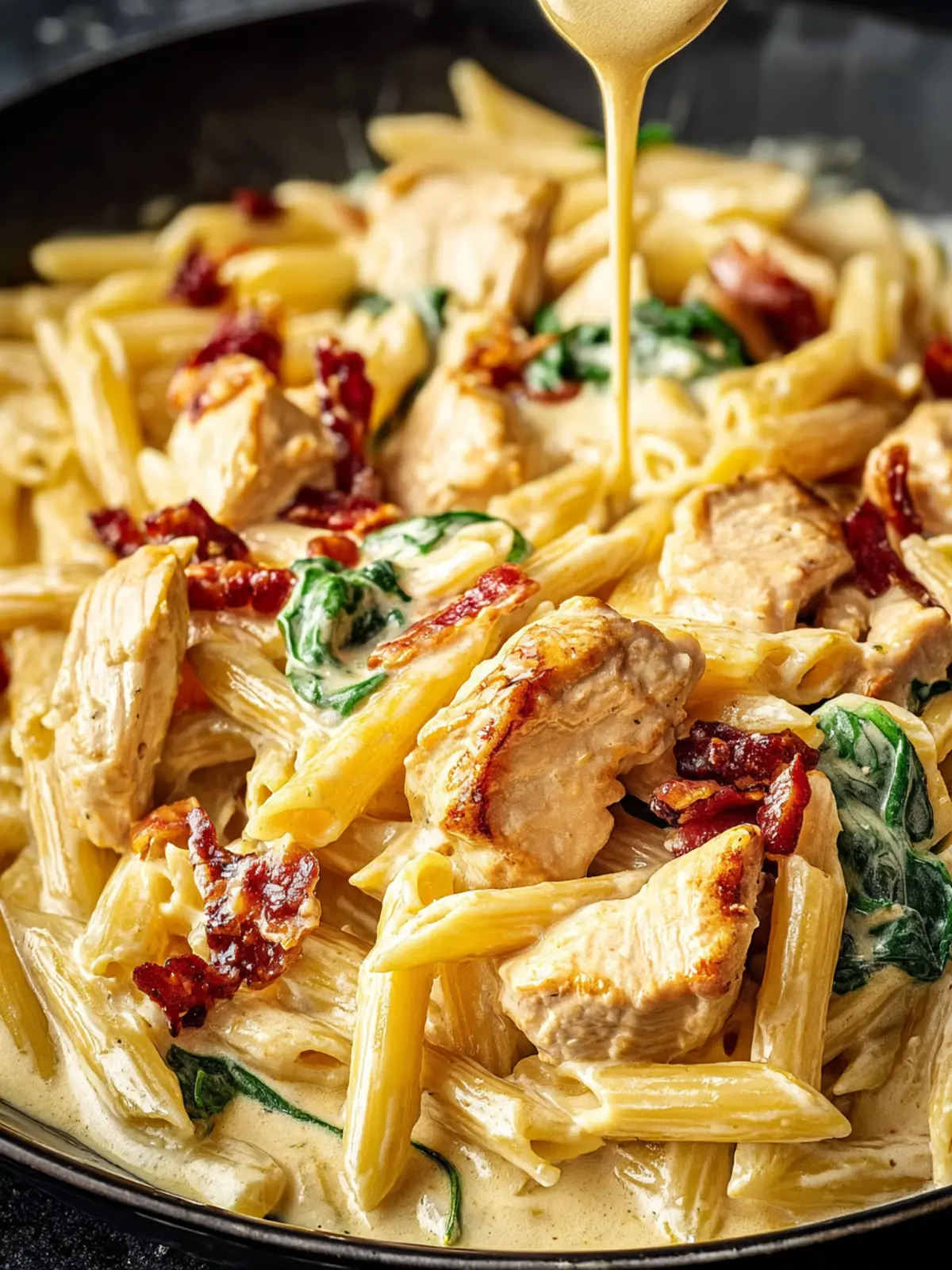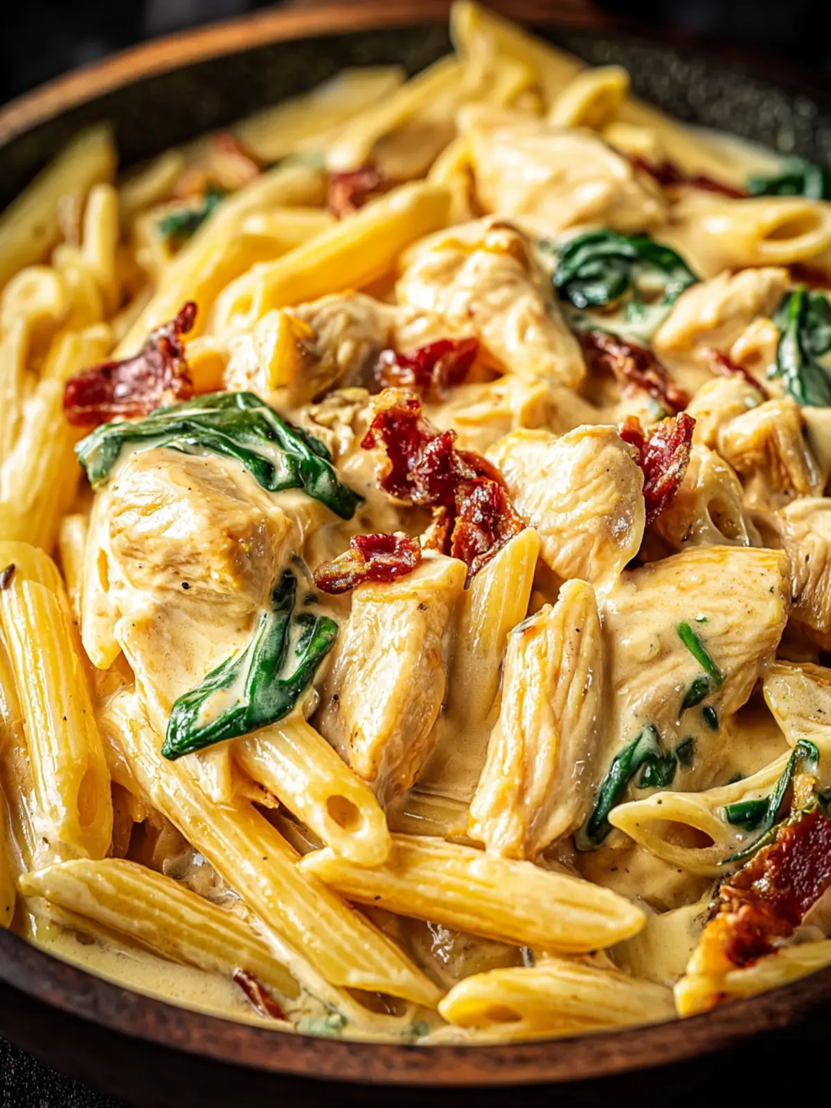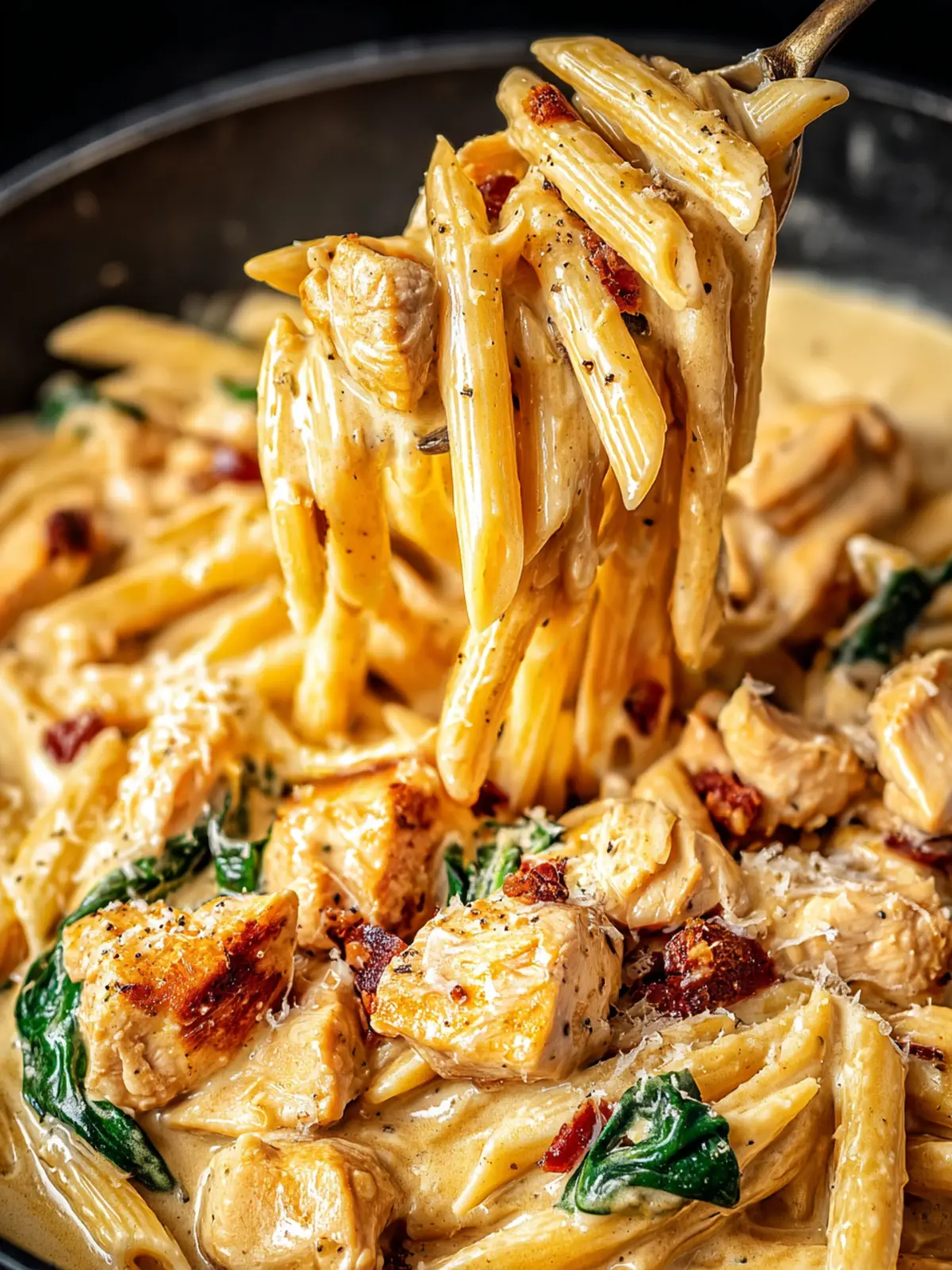 A delicious creamy chicken pasta dish with fresh spinach and sun-dried tomatoes.