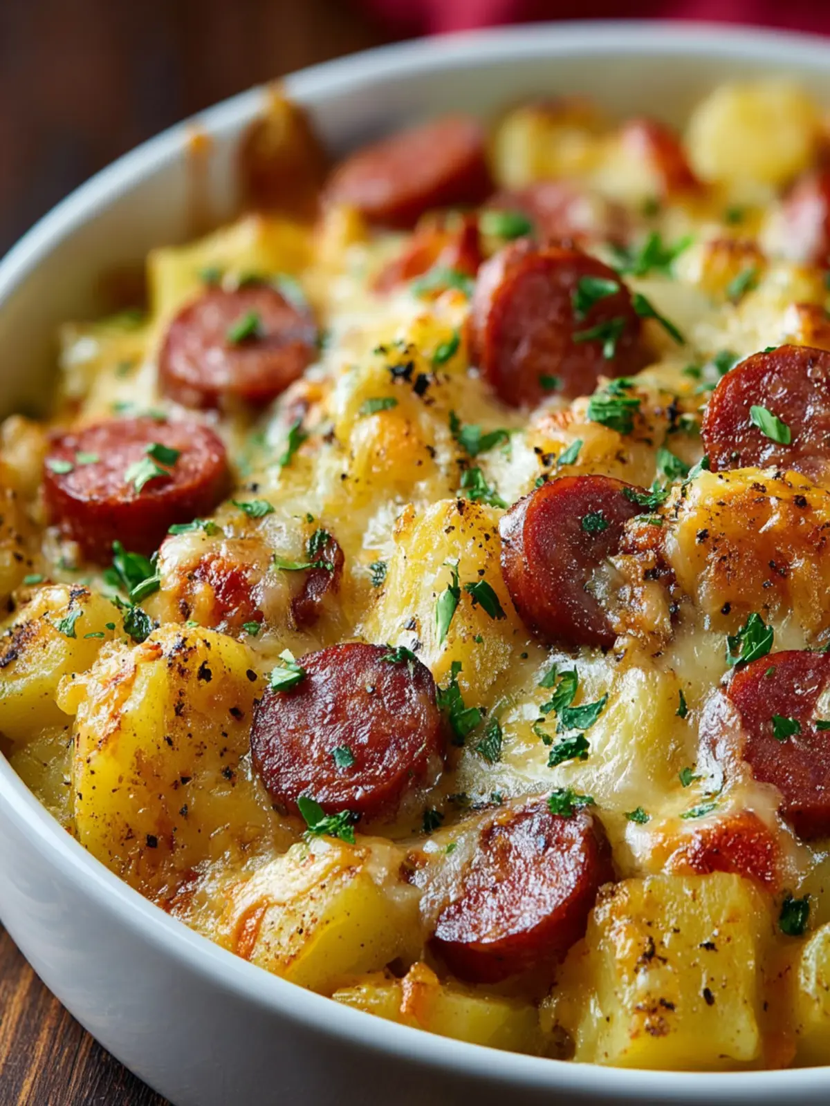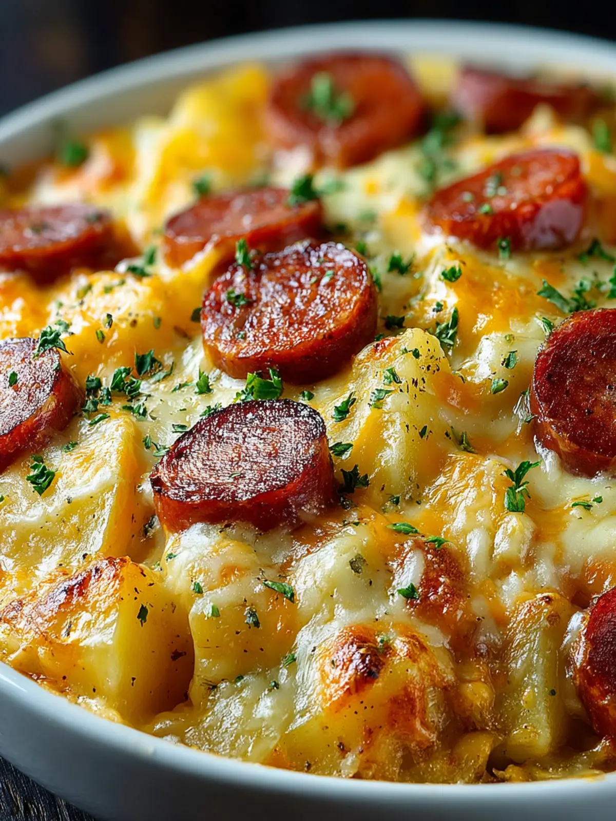 Deliciously creamy and cheesy potato casserole with smoked kielbasa and garlic, perfect for a comforting dinner.