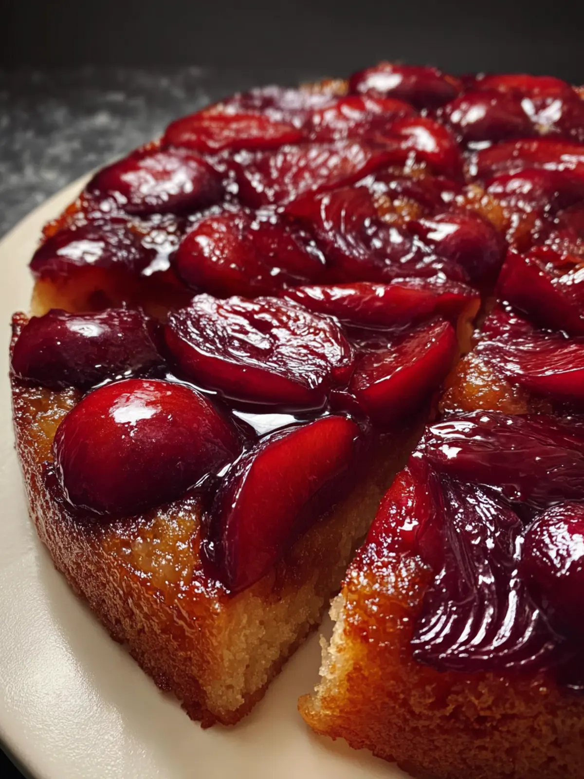 - Allow the cake to cool in the pan for about 10 minutes. Then, carefully invert it onto a serving plate. Let it sit for a few minutes to allow the caramelized plums to settle.