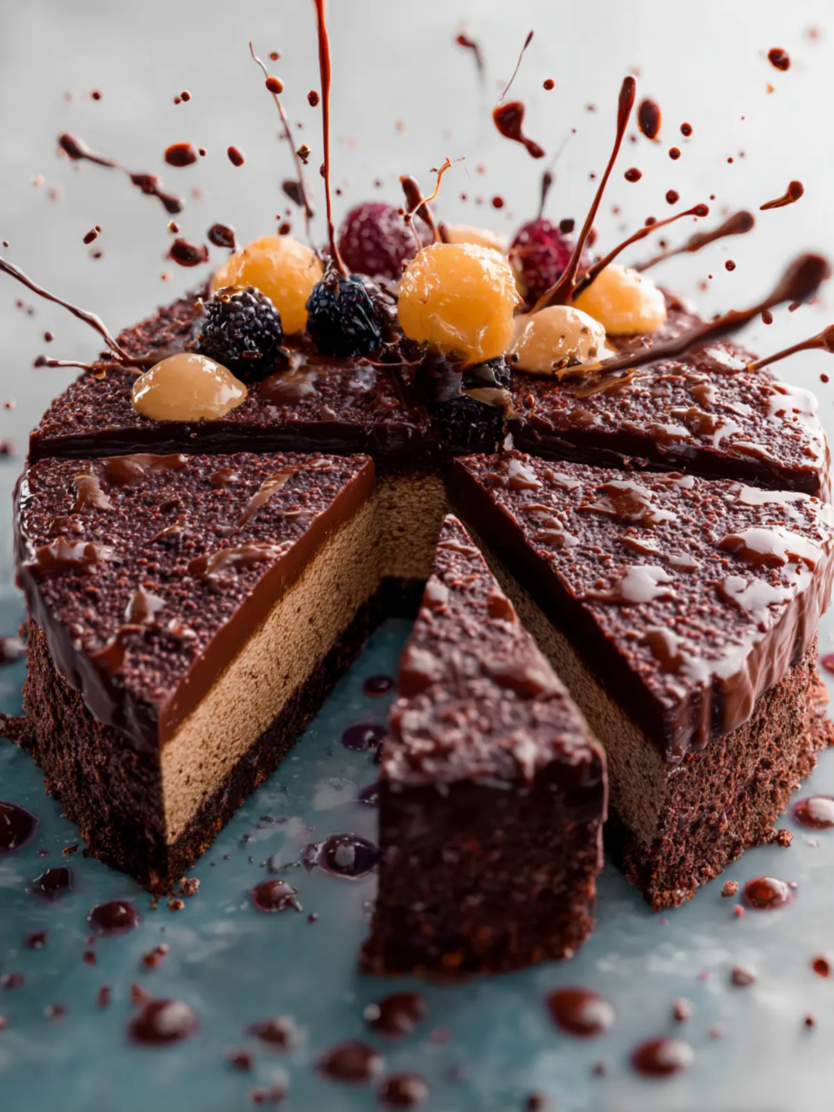 A delicious vegan chocolate cake made with oat flour and protein powder.