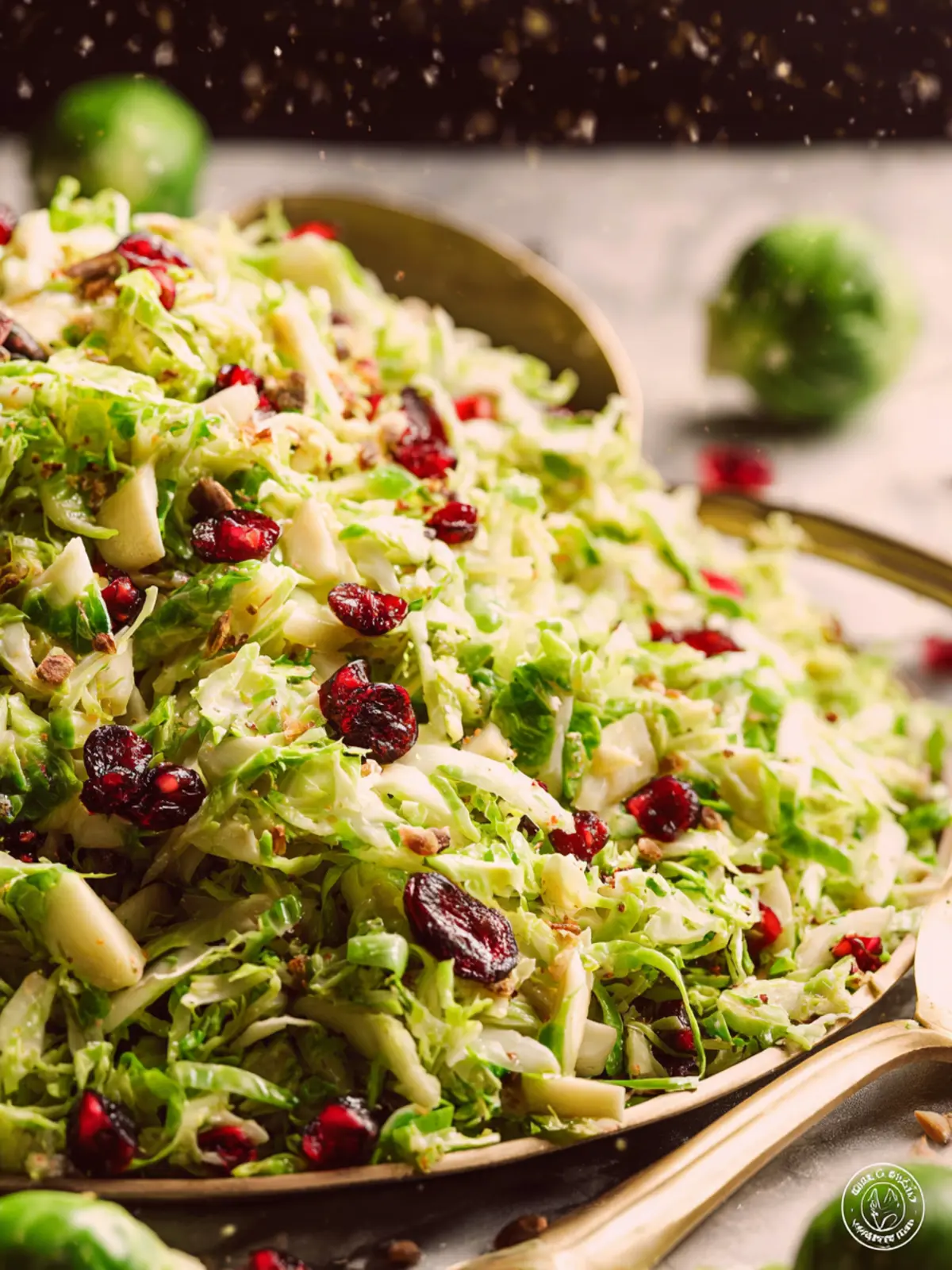 A fresh and vibrant salad featuring shaved Brussels sprouts, honey crisp apple, dried cranberries, and a delicious honey lemon dressing.