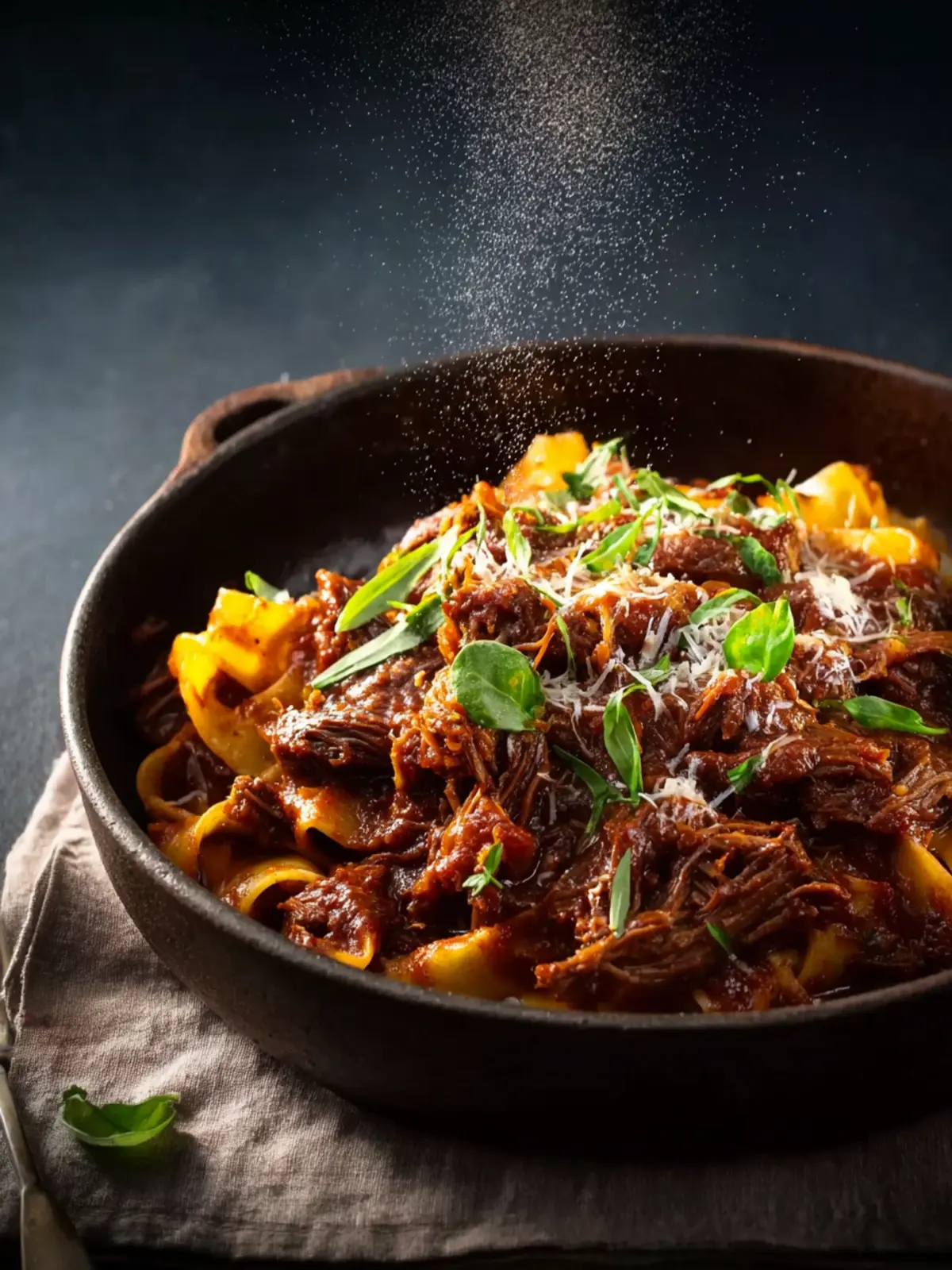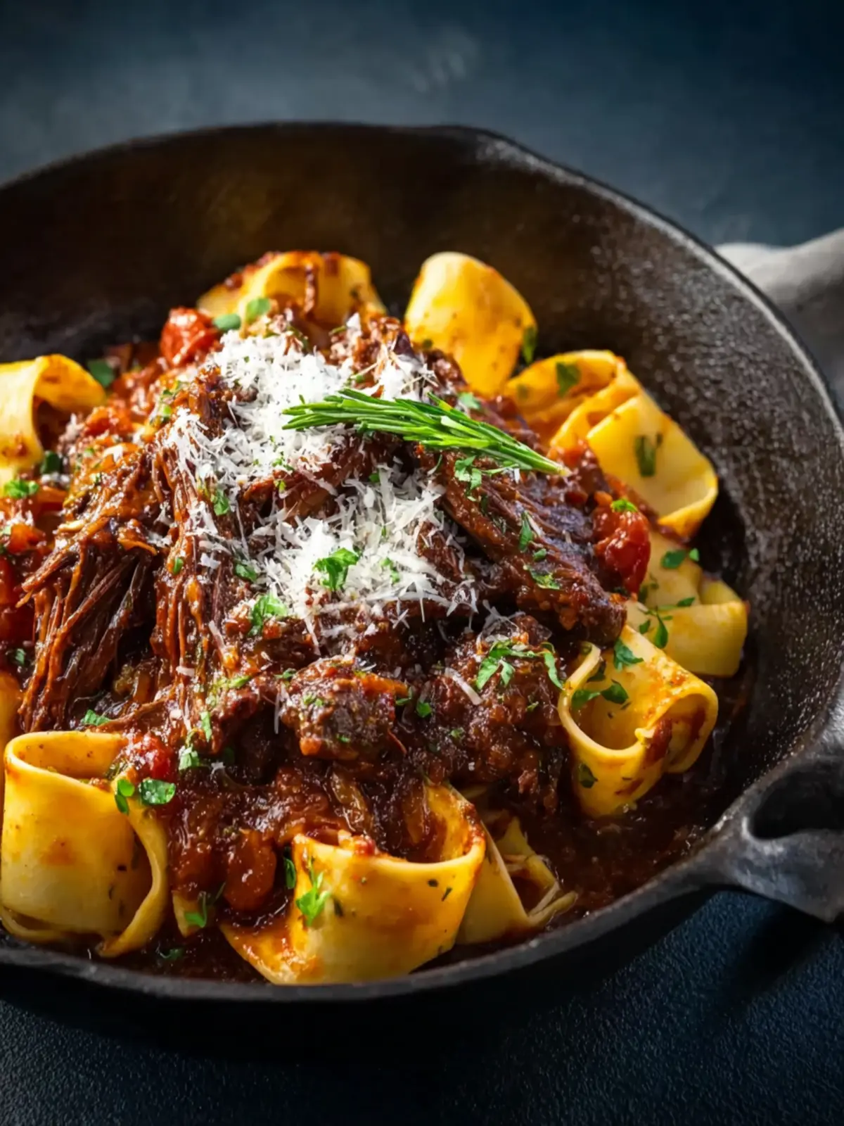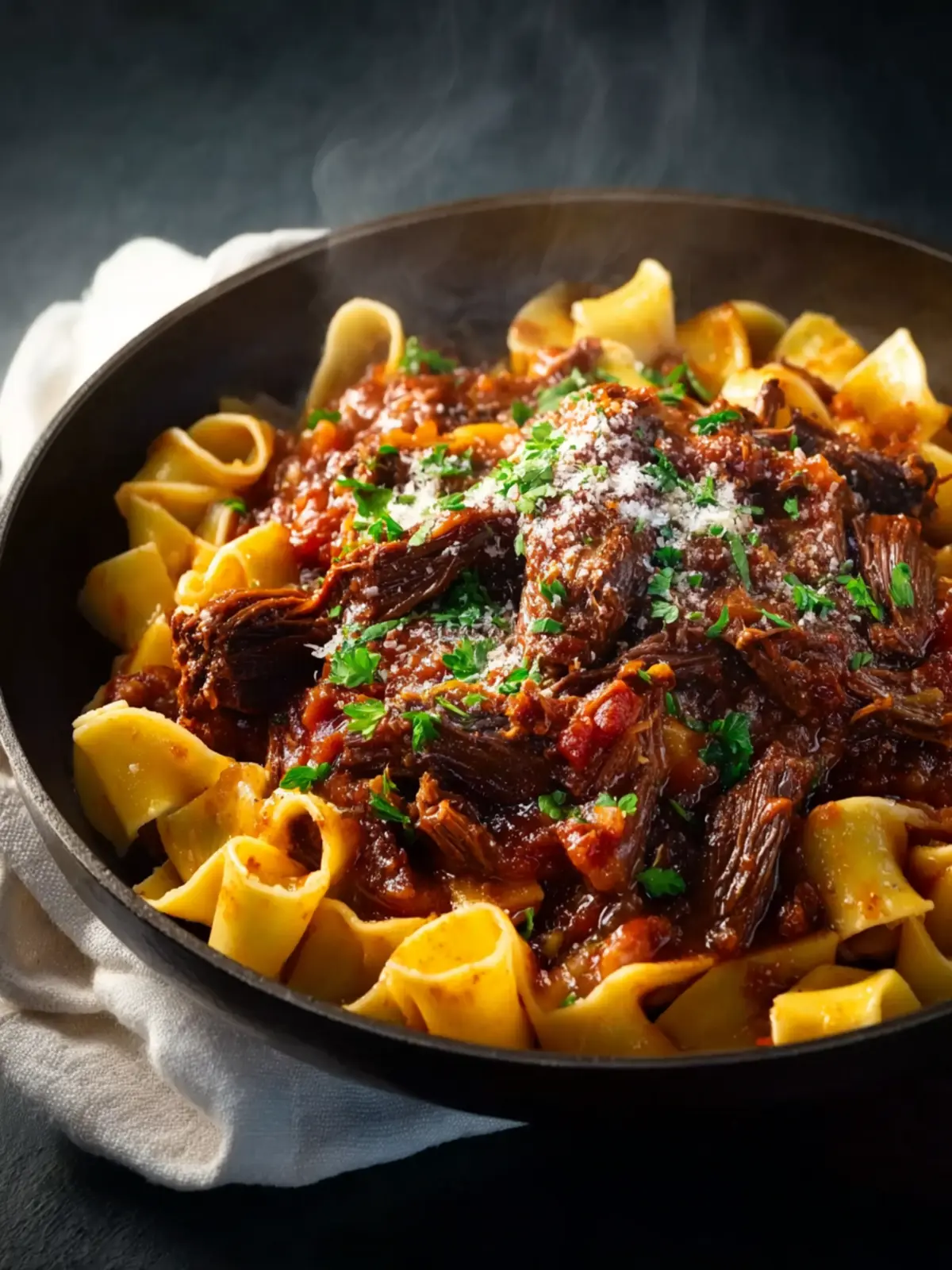 A rich and savory short rib ragu served over pappardelle pasta, perfect for a comforting meal.