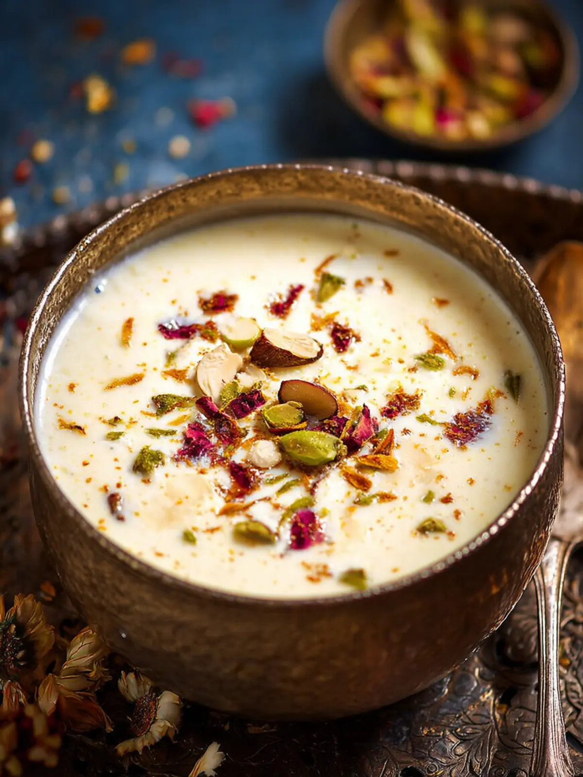 - Serve the kheer hot or chilled. Garnish with slivered nuts and dried rose petals.