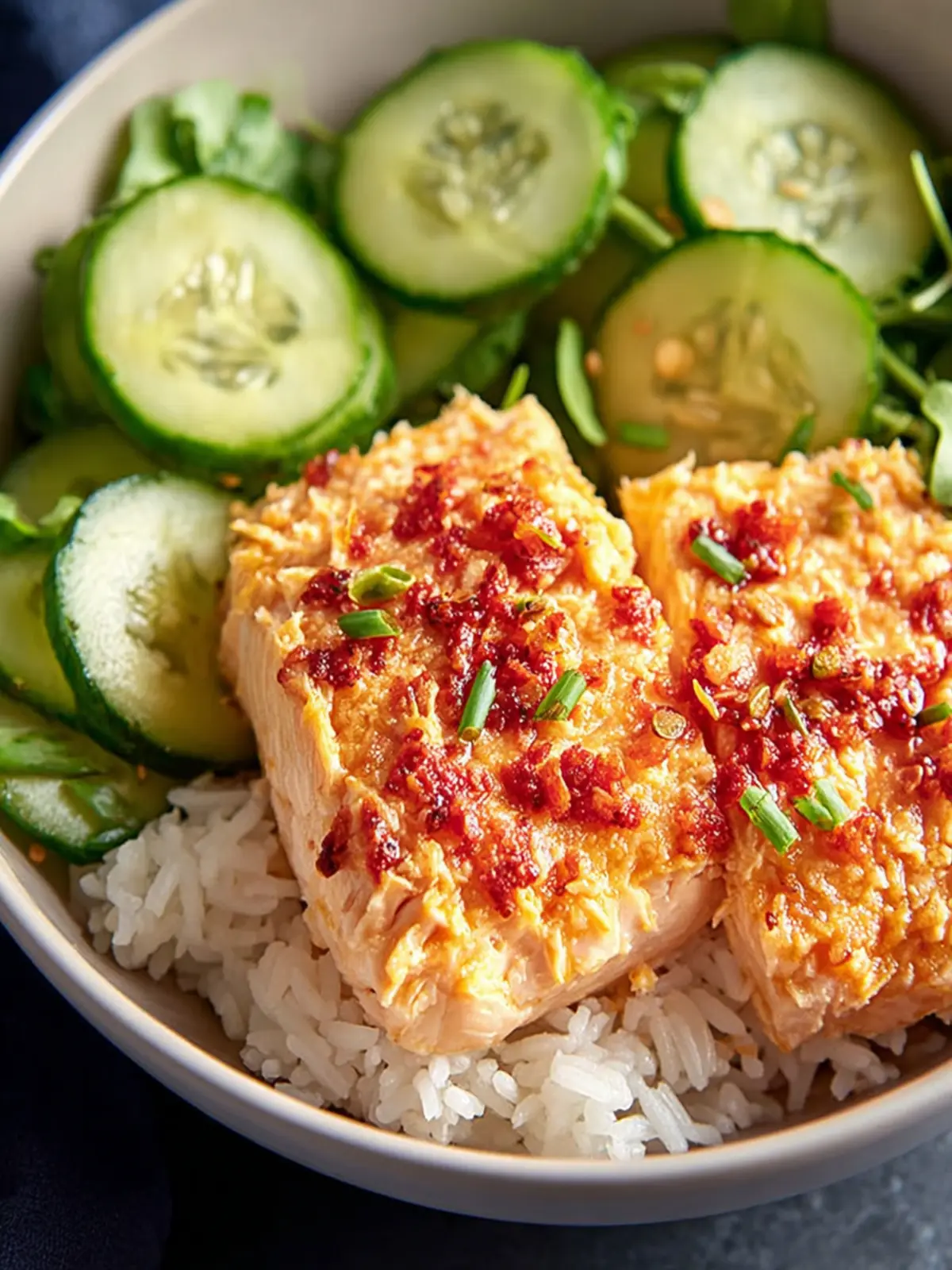 - Distribute the spicy tuna mixture evenly over the rice and serve with cucumbers and sesame seeds on top, if using.